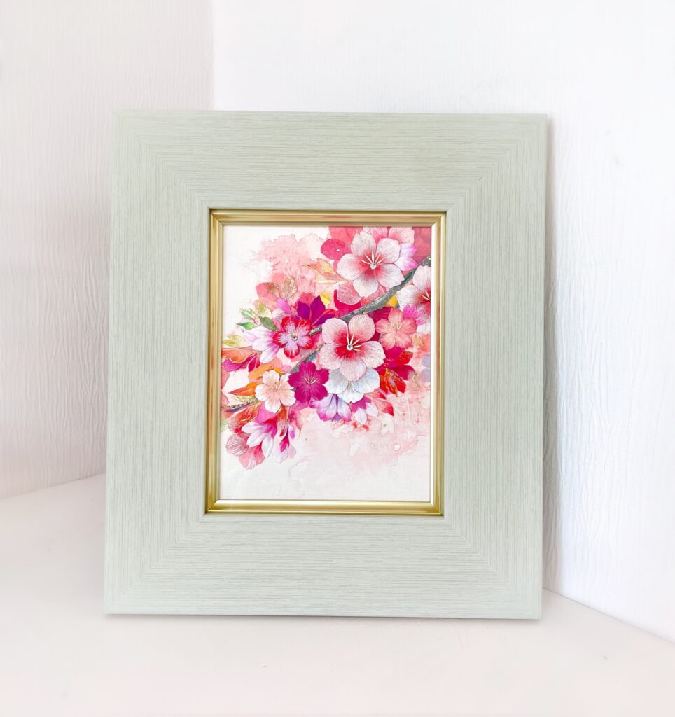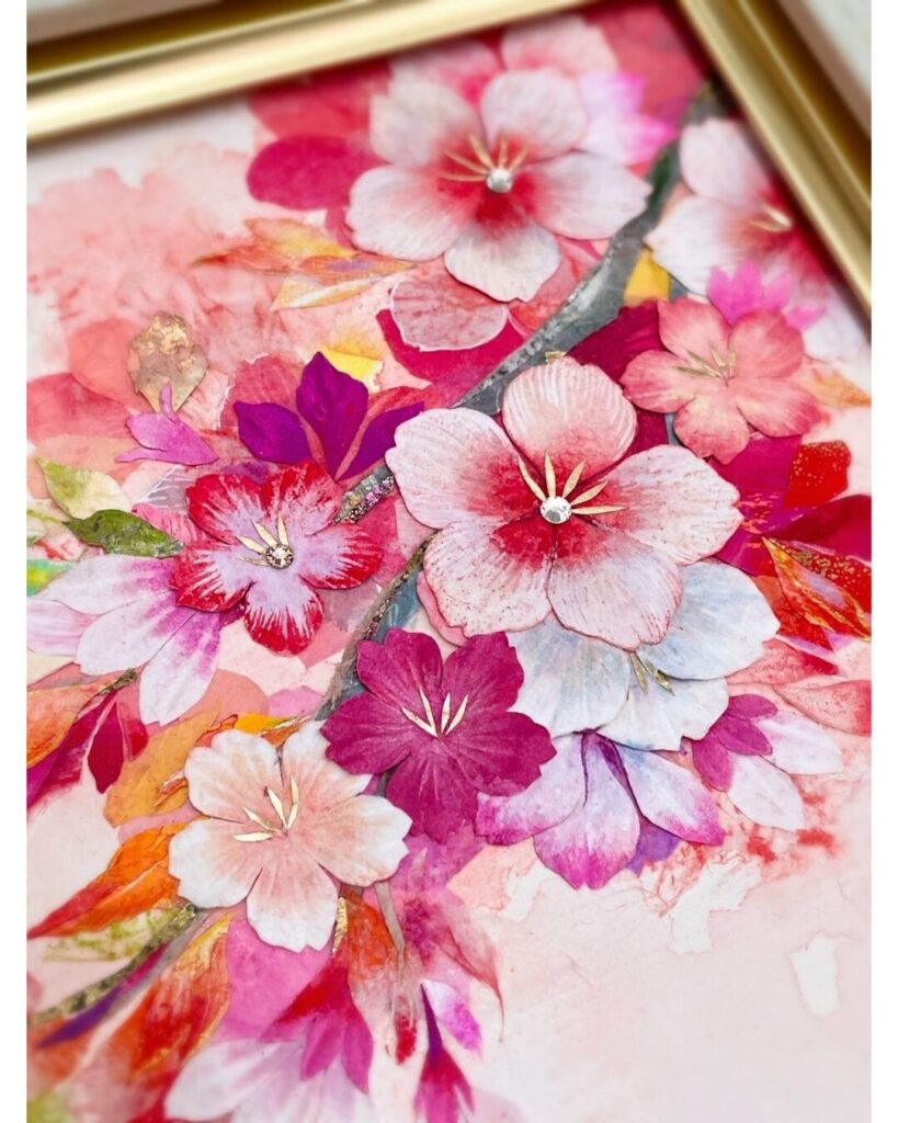 じんわりと紅潮する色彩で染めた和紙の花びらを何枚も重ねて描いた満開のソメイヨシノ。